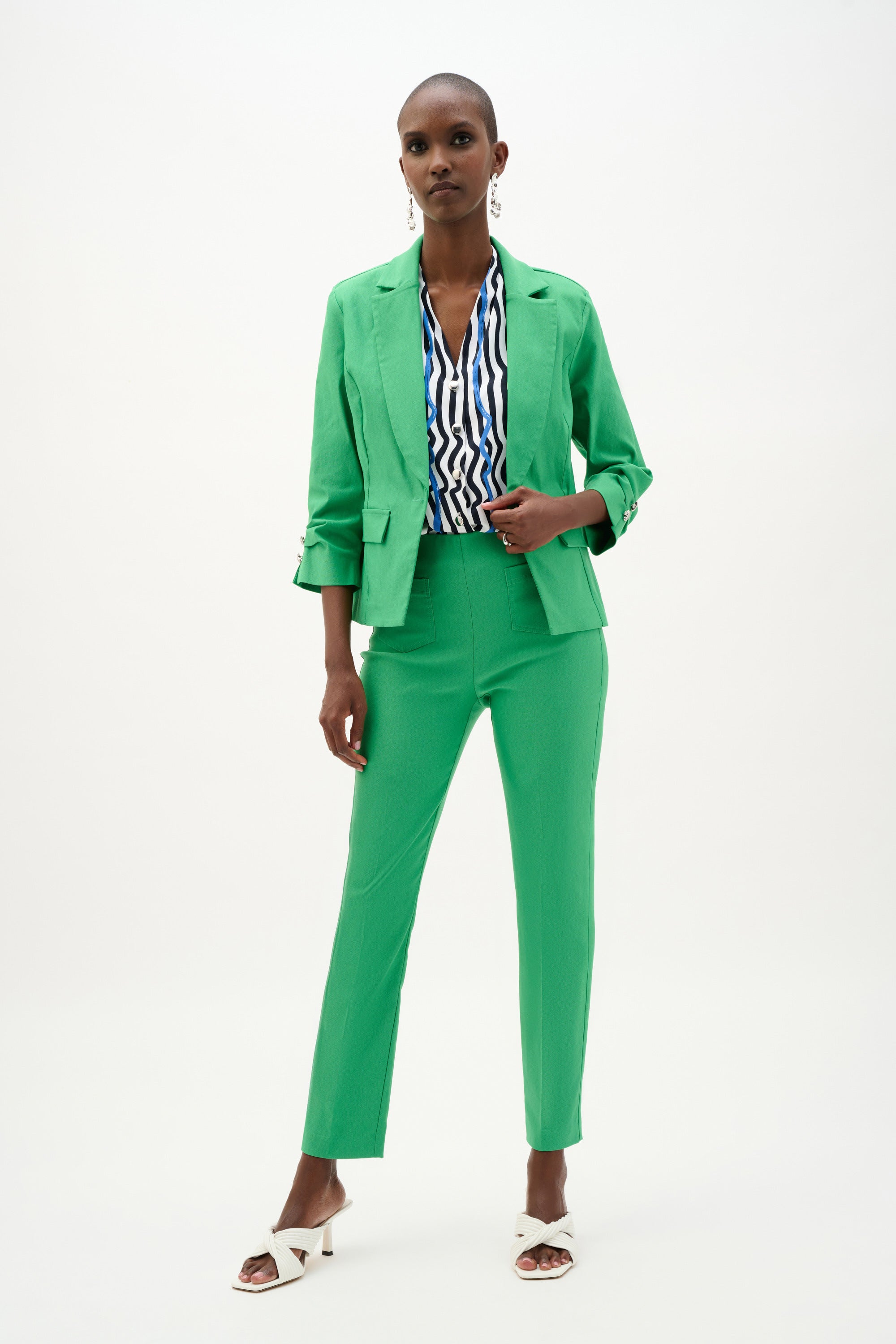 This solid millennium blazer is sharply tailored with a fitted silhouette and a notched collar. A silver statement button at the front and tucked three-quarter sleeves with matching buttons bring a touch of polished structure to the look.