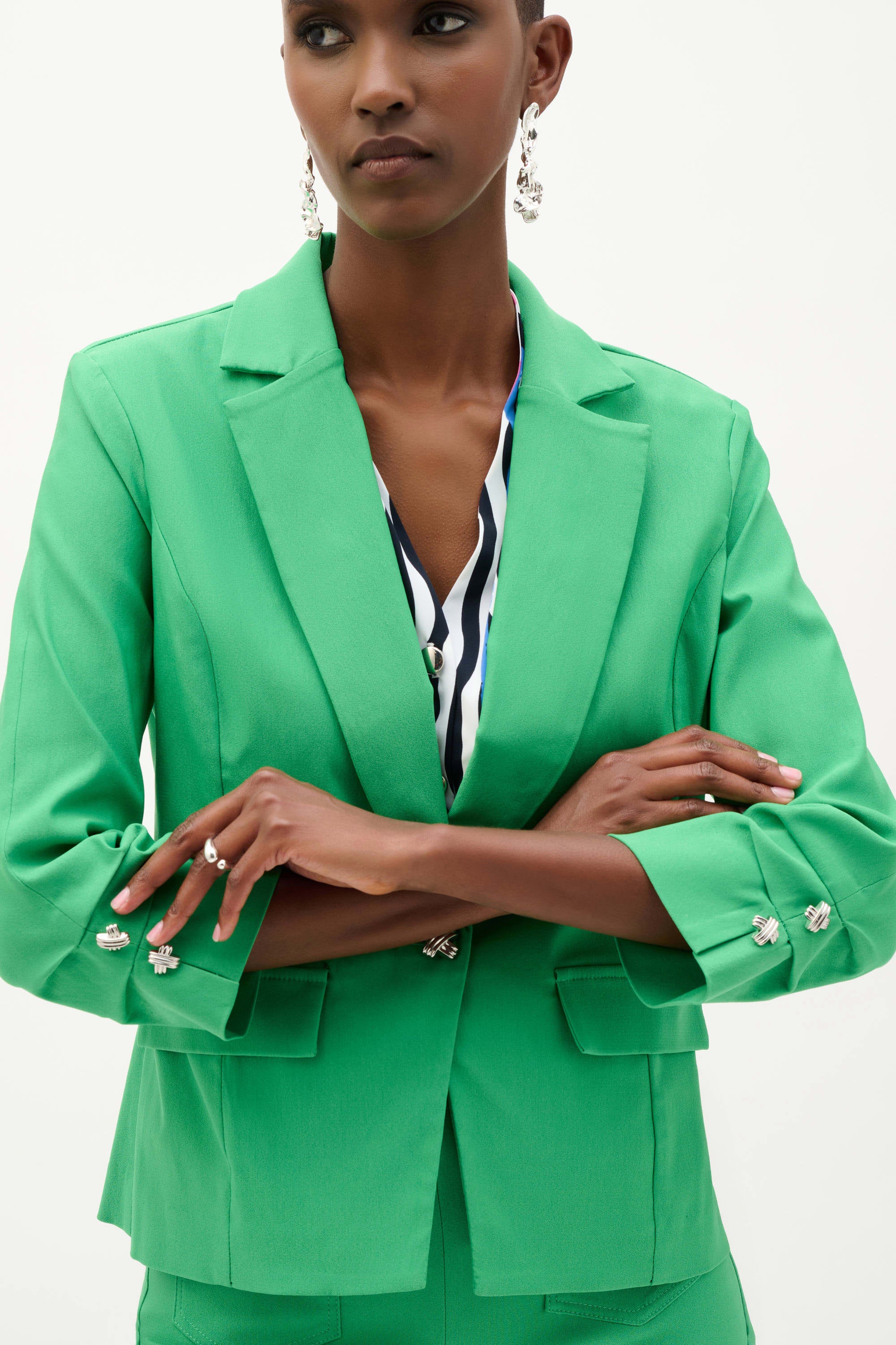 - Three-quarter sleeves with tuck details and silver buttons