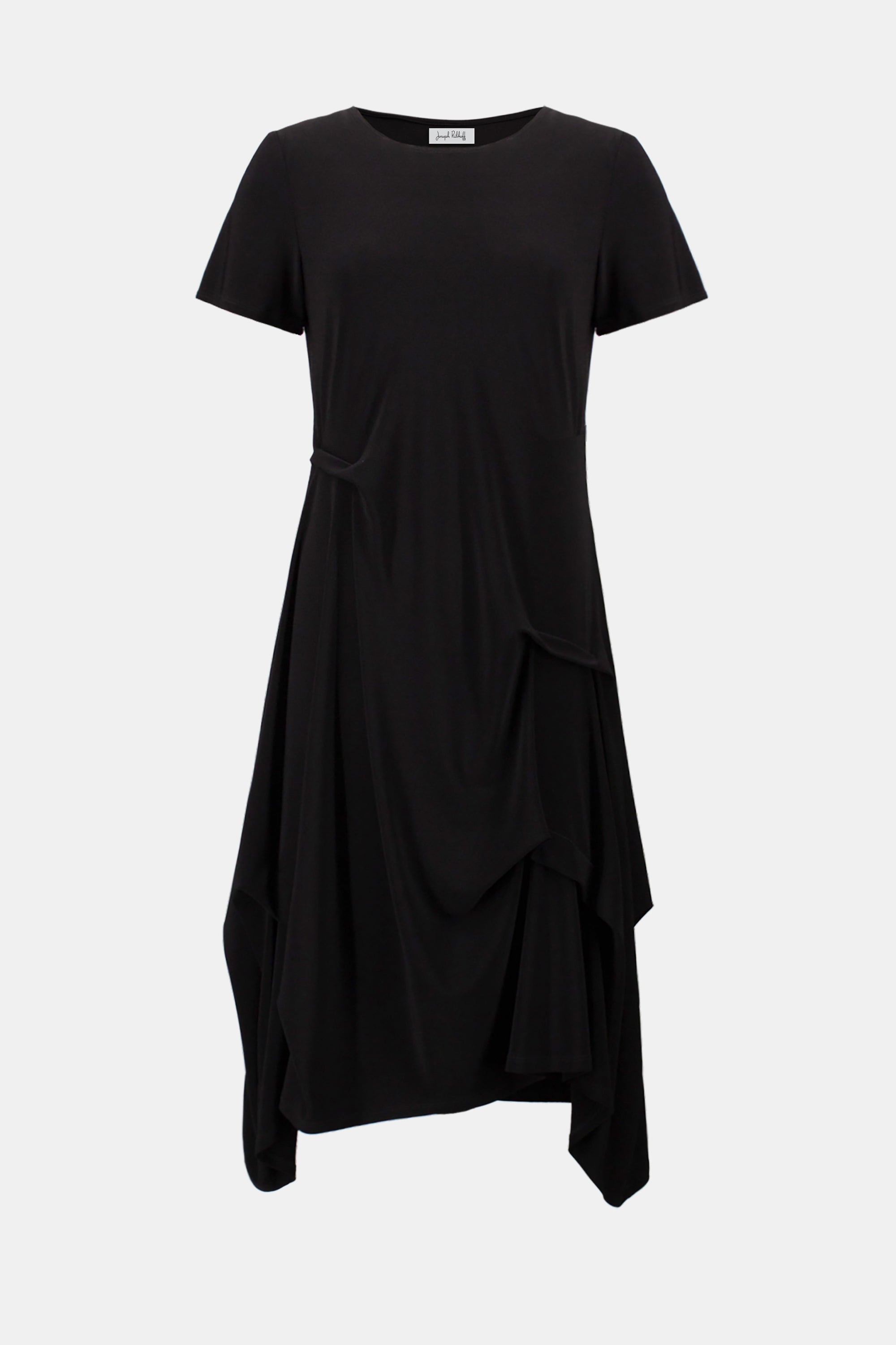 This silky knit dress features a boat neckline and short sleeves in a flowing trapeze silhouette. Tuck stitching details add subtle texture, while the below-the-knee length offers a balanced, graceful finish.