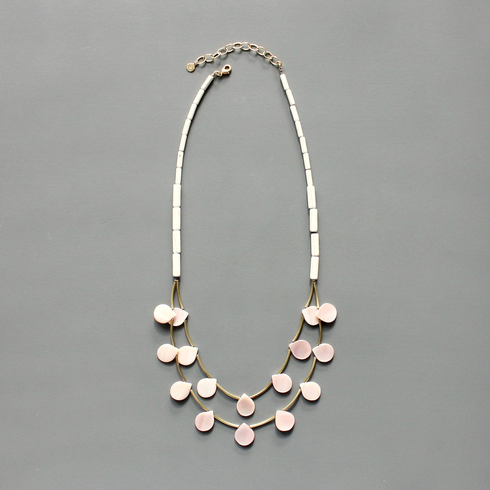 22” necklace with magnesite and pink mother-of-pearl teardrops. 3 inch extender.