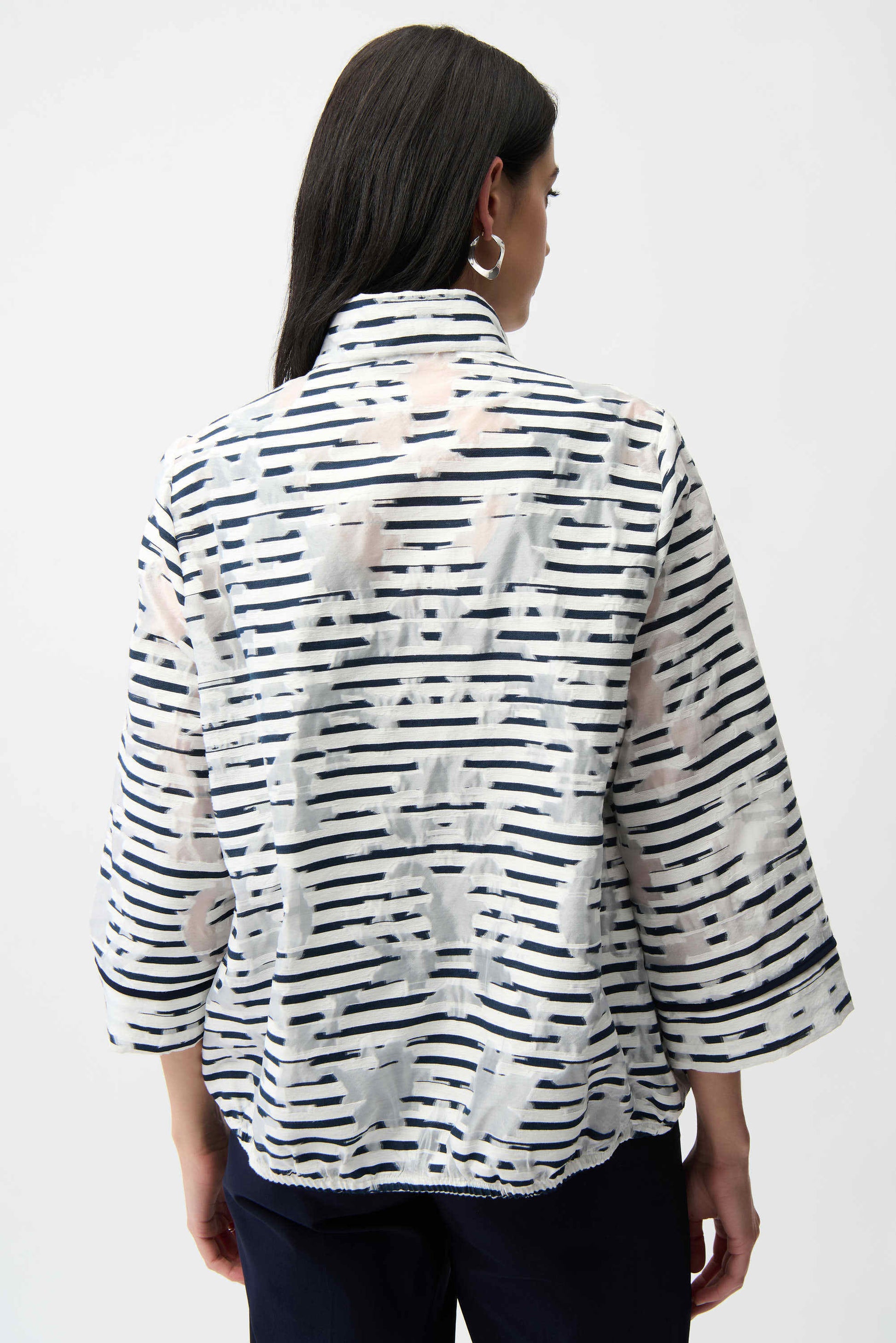 Sheer and structured, this jacquard organza bomber jacket features bold stripes, a mock neck stand collar, three-quarter bell sleeves, and a sleek front zip closure for modern edge.