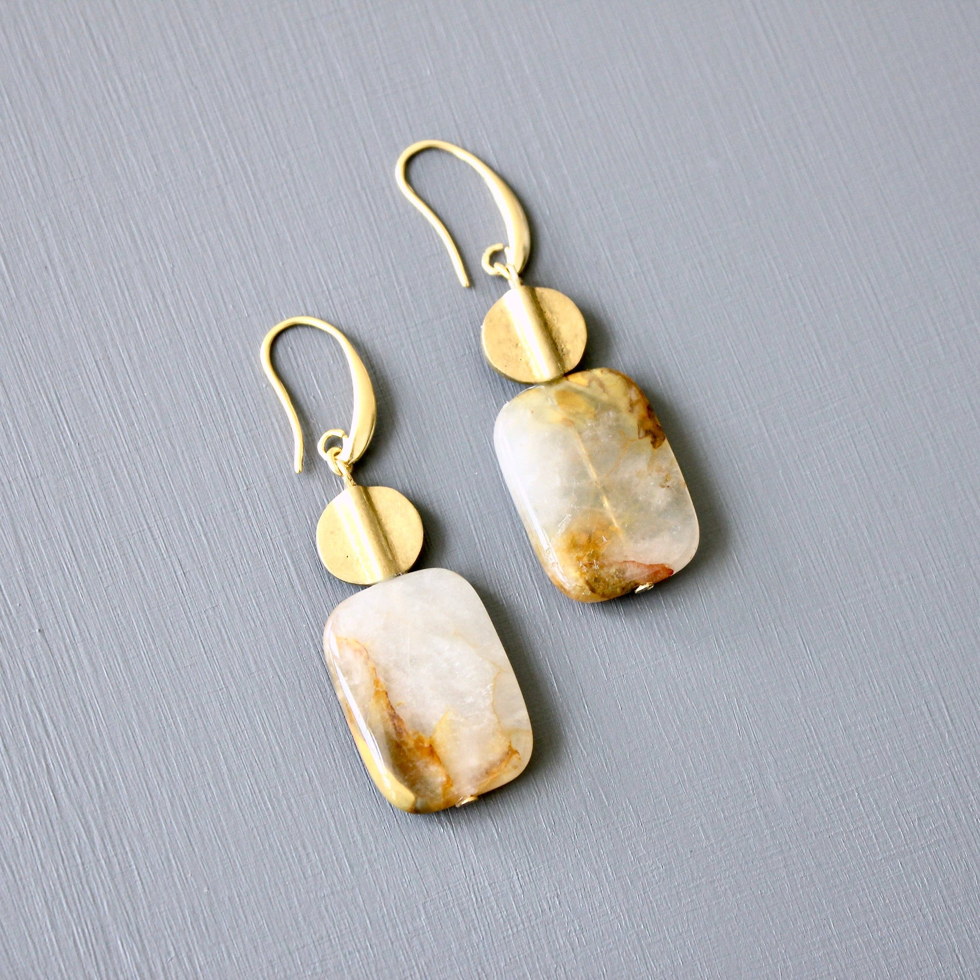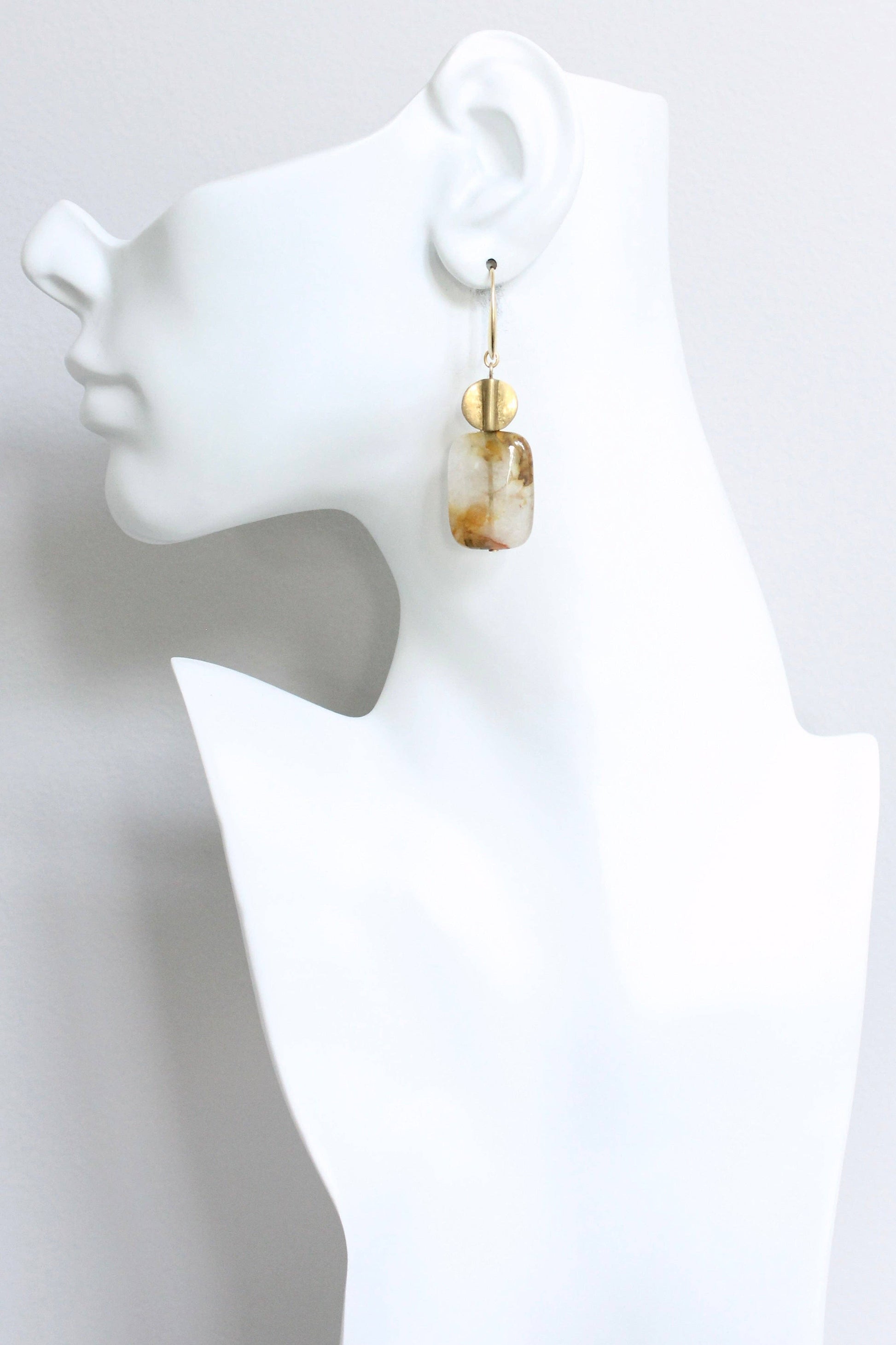 18k Gold plated brass hooks with agate and brass. Each earring weighs .265 oz. and measures 2.375 inches in length from top to bottom.