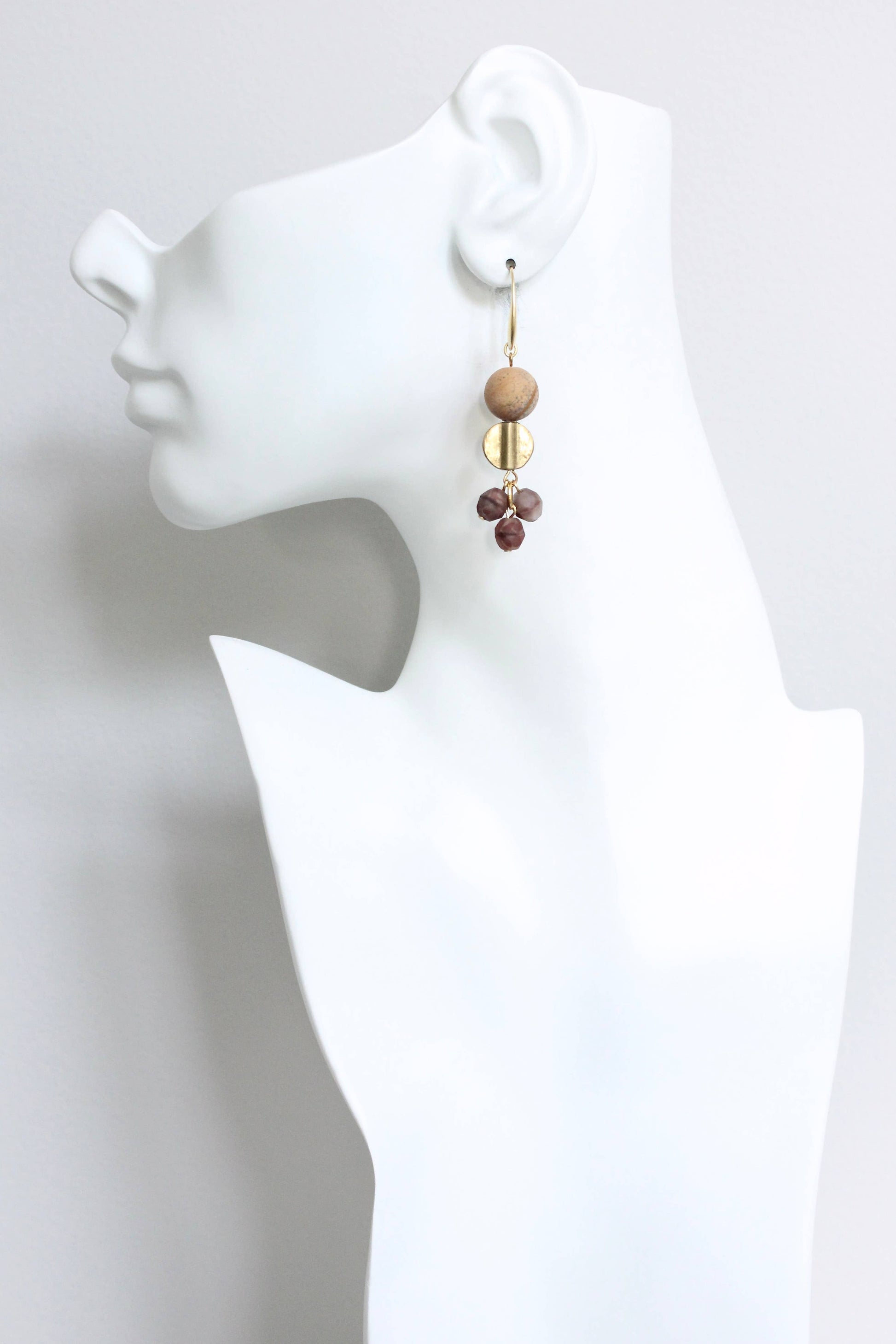 18k Gold plated brass hooks with jasper, glass, and brass. Each earring weighs .23 oz. and measures 2.5 inches in length from top to bottom.