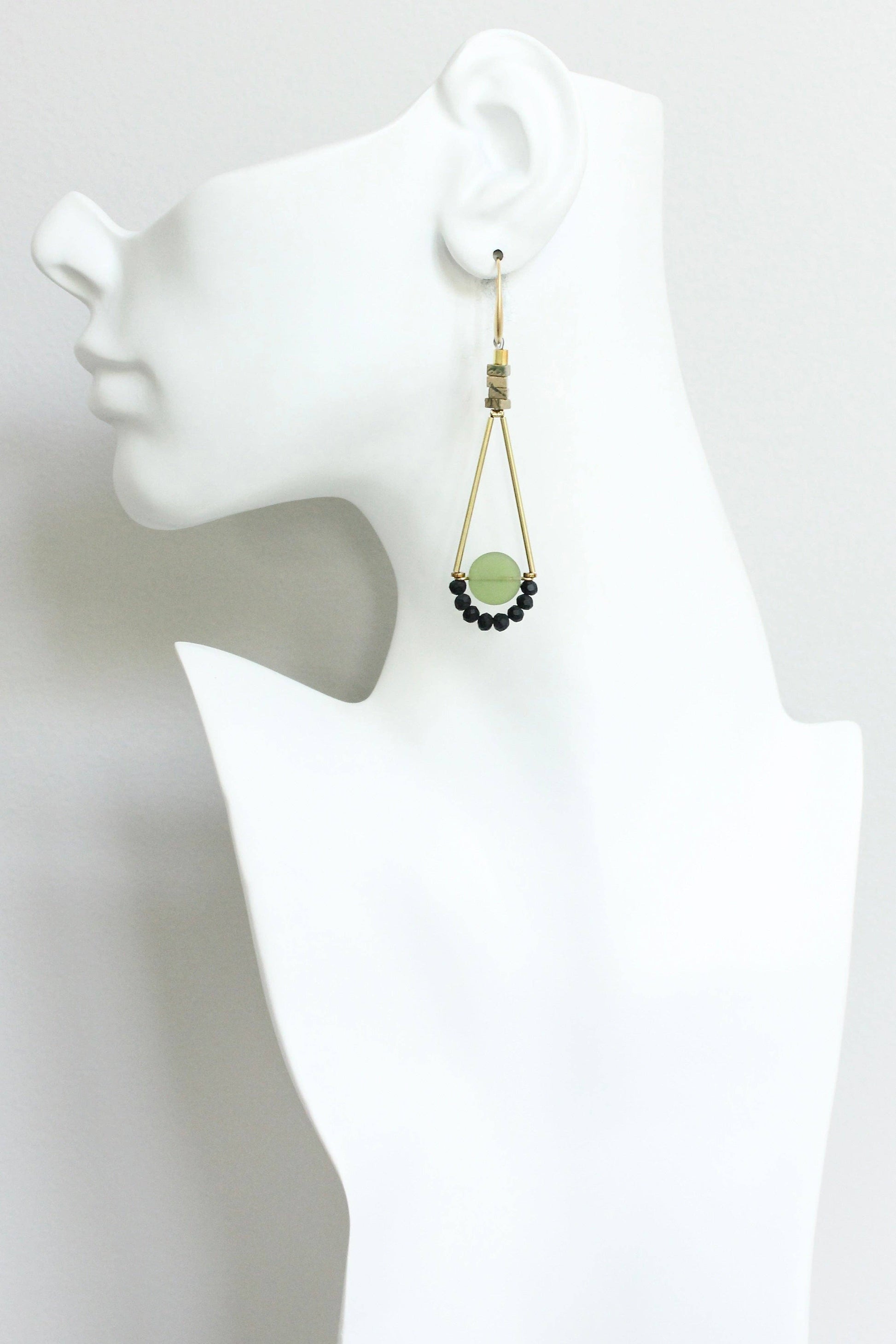 18k Gold plated brass hooks with synthetic jasper chips and glass. Each earring weighs .10 oz. and measures 3.25 inches in length from top to bottom.