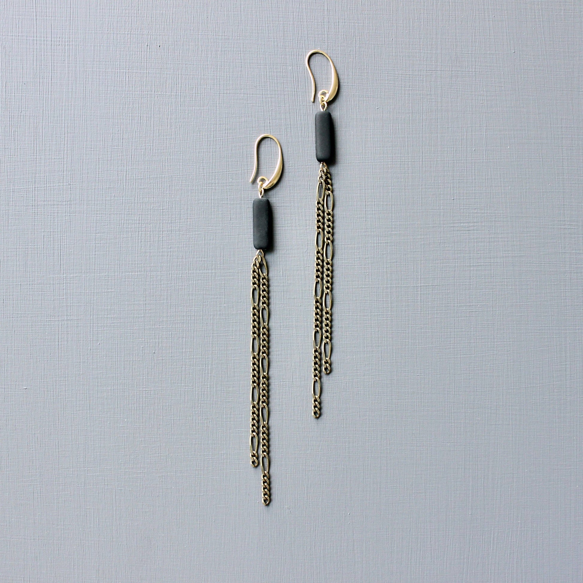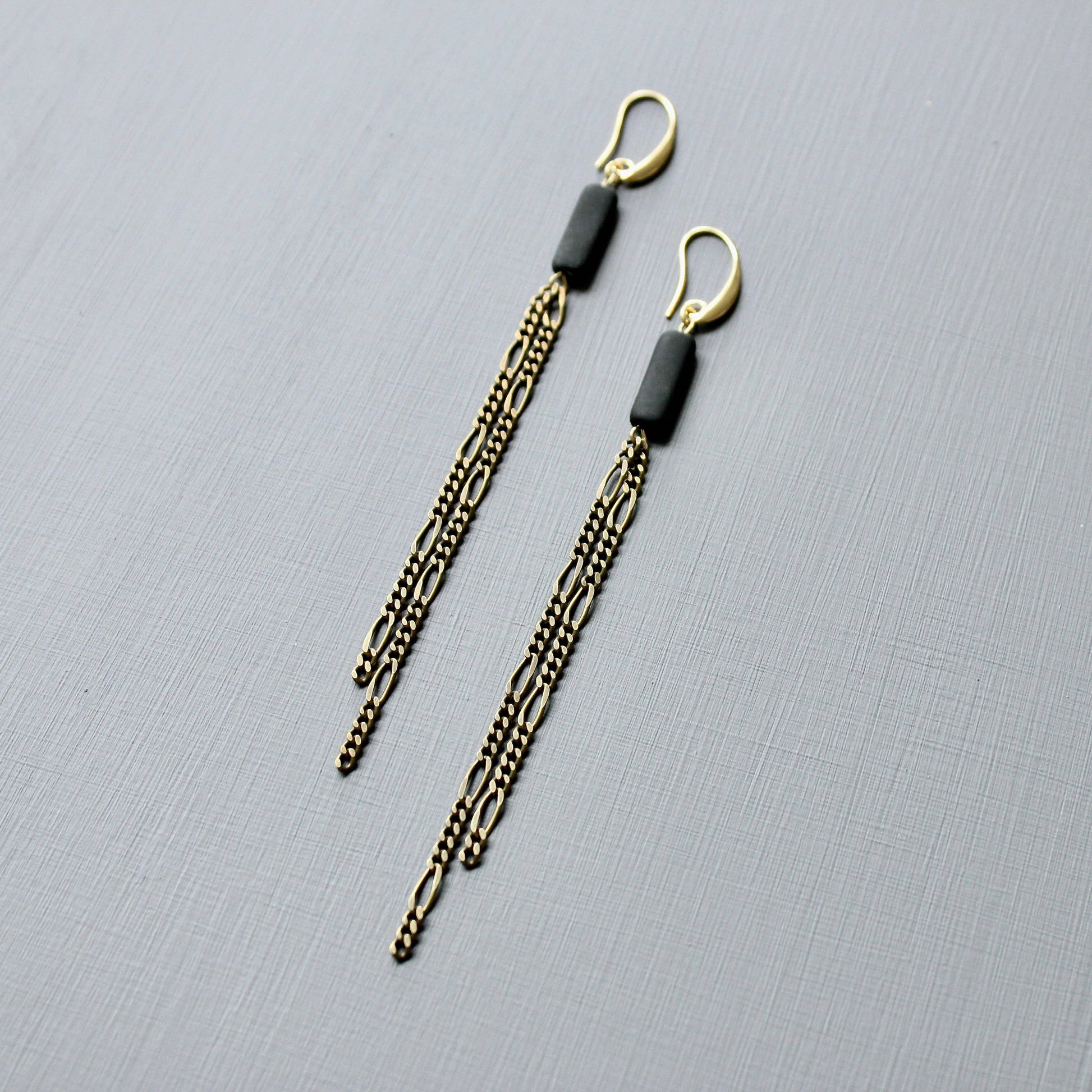 18k Gold plated brass hooks with black glass and brass. Each earring weighs .125 oz. and measures 5 inches in length from top to bottom.