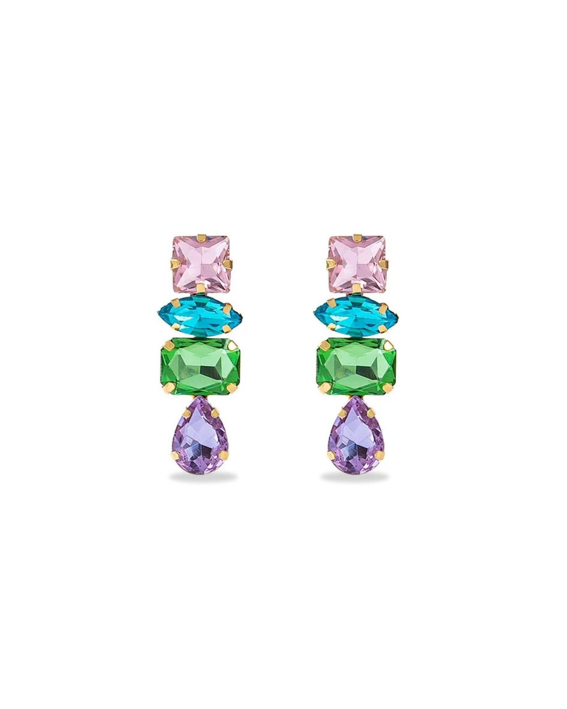 Make a bold, colorful statement with the Juniper Statement Earrings. These 1.75-inch earrings feature a stunning combination of glass stones in pink, blue, green, and purple. The mix of vibrant hues adds a playful yet elegant touch to any outfit, making them the perfect accessory for those who want to stand out. With their unique design and striking colors, these earrings are ideal for both everyday wear and special occasions.