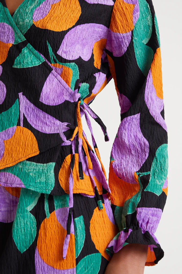 Apricot print seersucker wrap top. V-neckline and long sleeves with elastic cuffs and ruffle detail. Interior bow detail. The model is 175 cm tall and is wearing a size S.