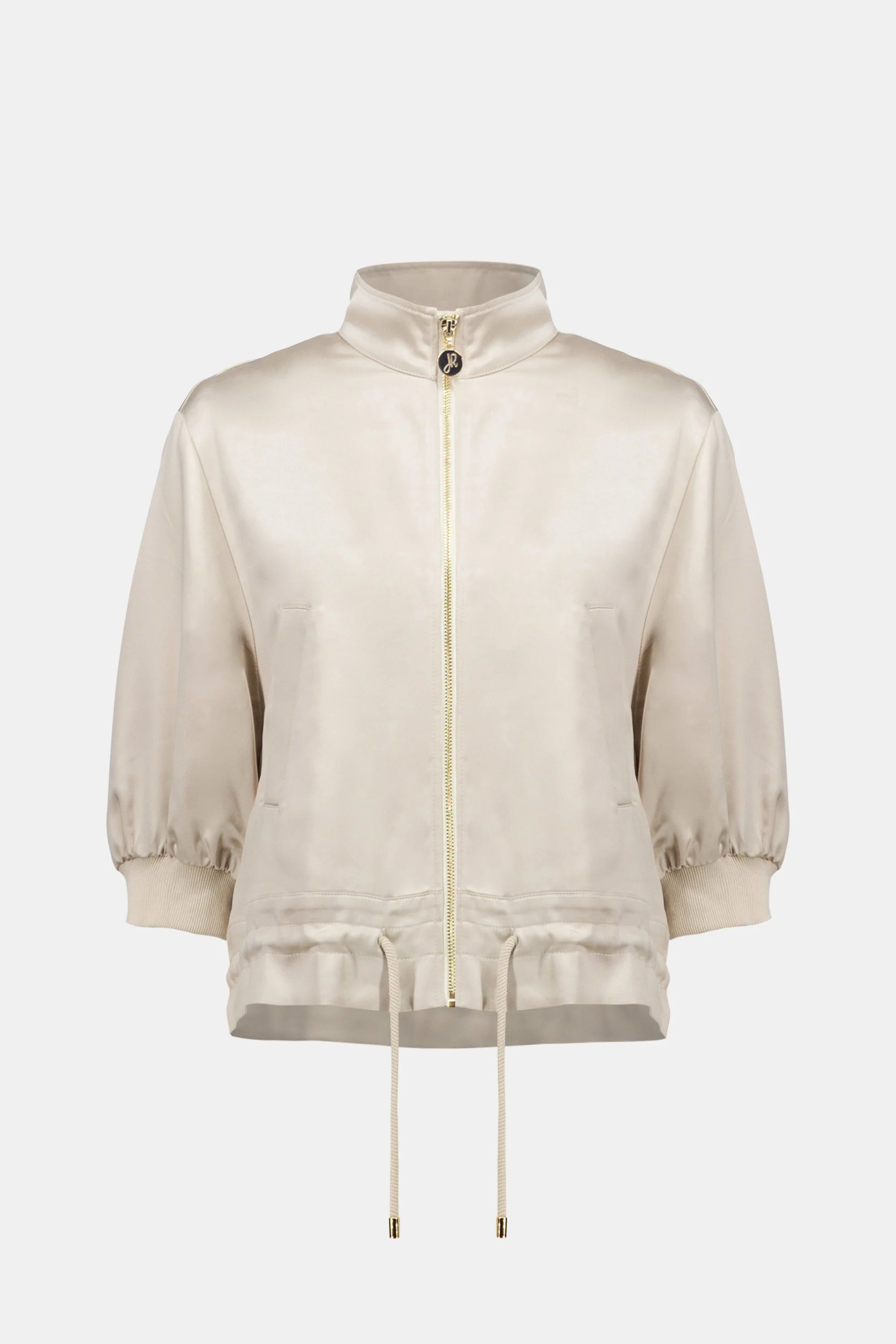 This satin boxy blouson jacket features a funnel neck collar, drop shoulder three-quarter sleeves with ribbed cuffs, and a drawstring hem. Finished with a metal zipper front closure and faux pockets, it offers a modern, relaxed fit.