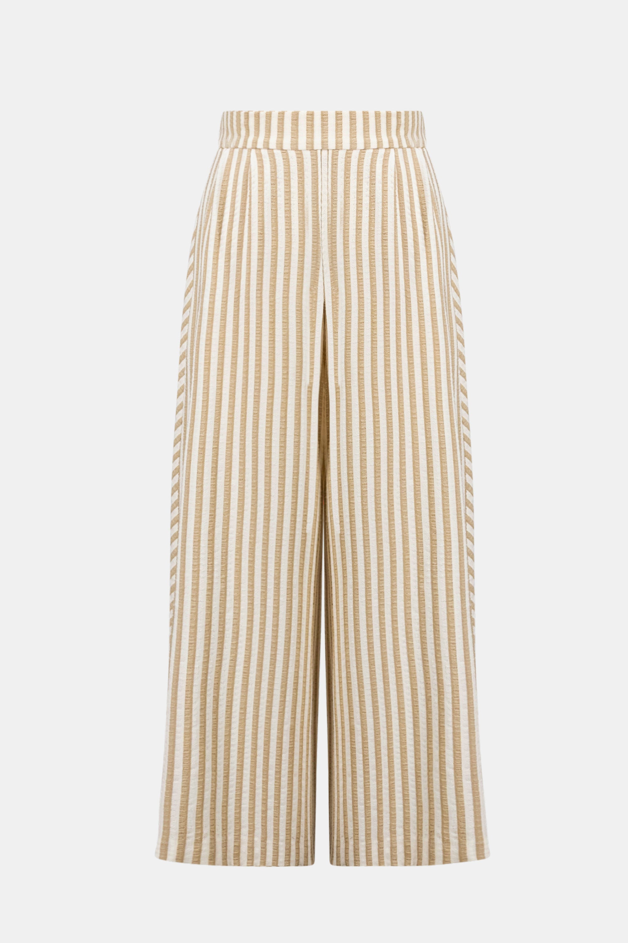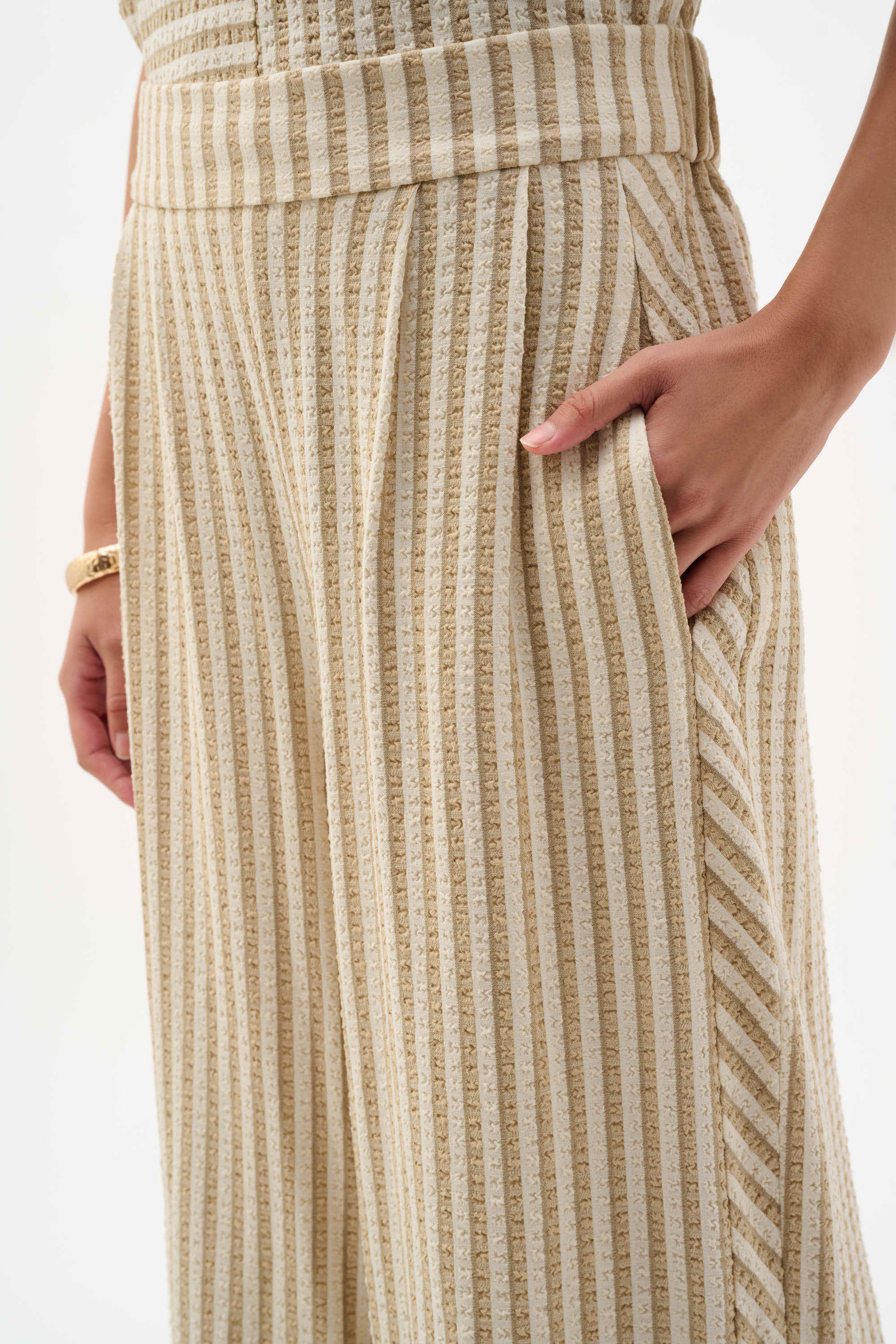 Yarn-dyed stripes ripple across woven wide leg pants, their textured weave lending depth and quiet dimension. A pull-on waistband and side pockets complete the design, balancing everyday comfort with a breezy, elevated appeal.